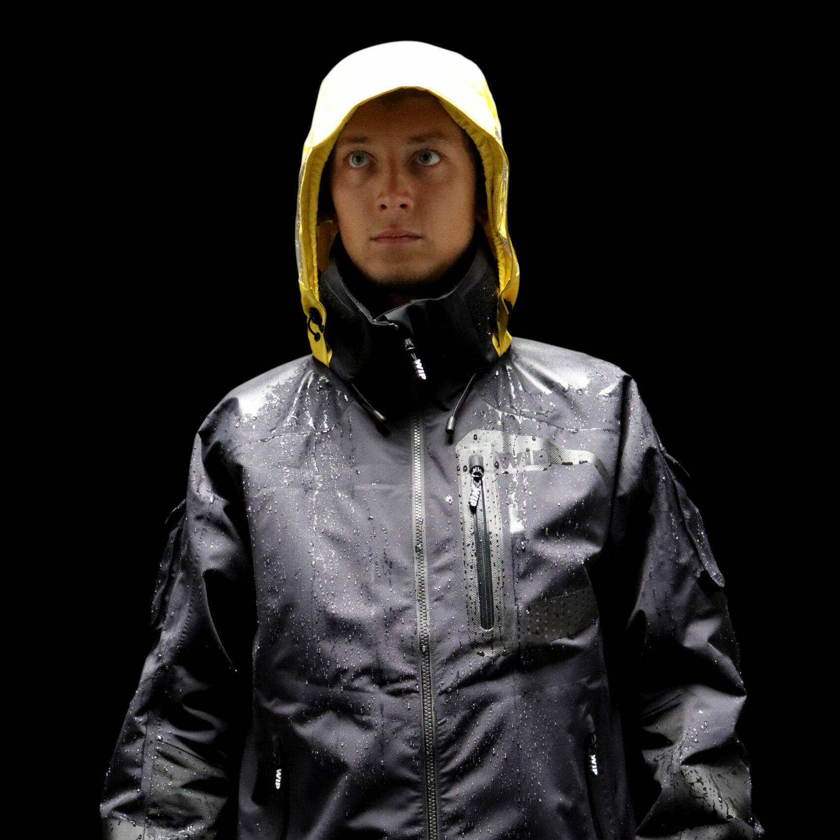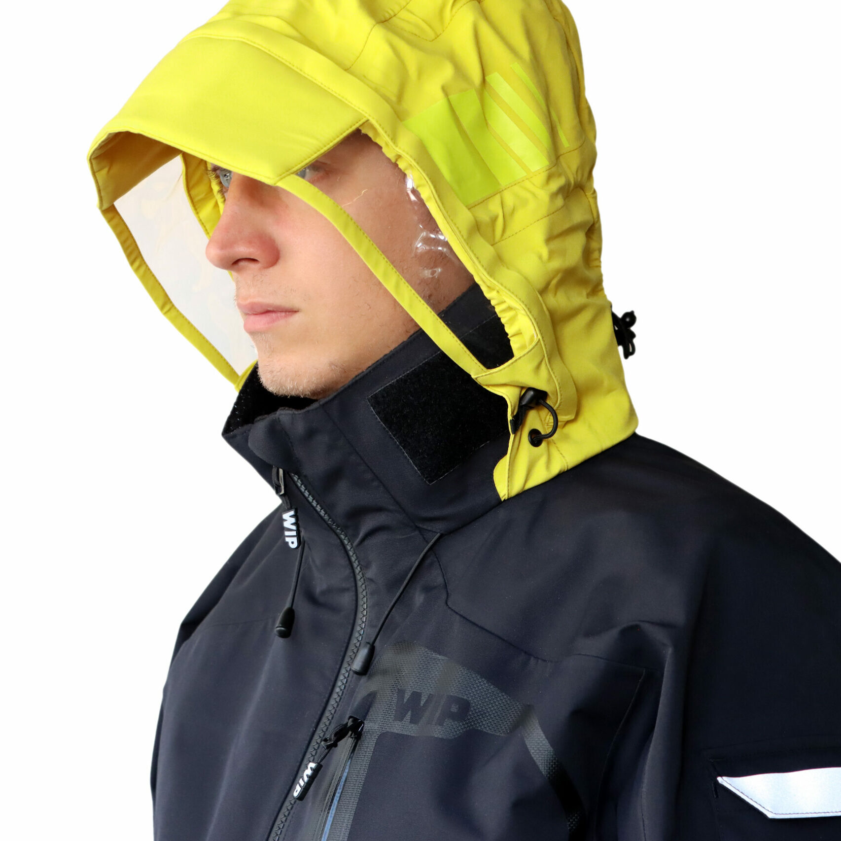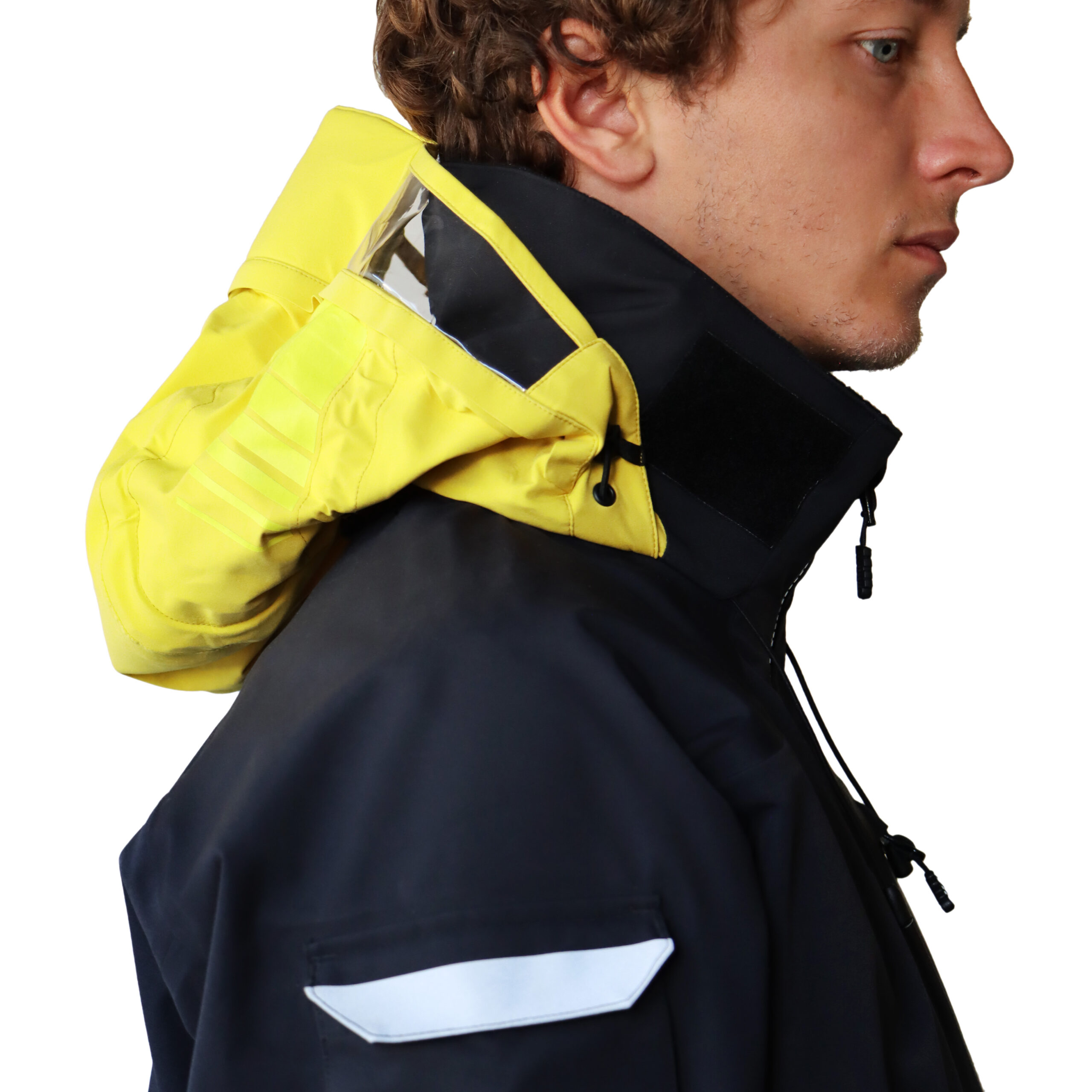 >capuche dotée de panneaux transparents qui augmentent la visibilité du porteur. Permet plus de sécurité lors de la navigation.
